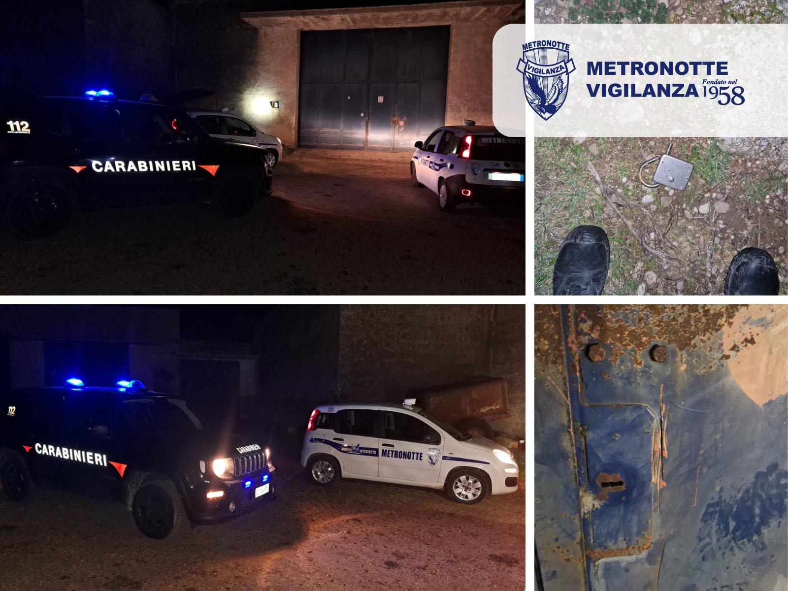 La Guardia Giurata ha notato il lucchetto della sbarra del cancello dell’Azienda Agricola spezzato a terra. Durante il controllo dell’area, ha osservato alcuni soggetti fuggire nei terreni circostanti. In quel momento, i malviventi stavano utilizzando un flessibile per tagliare la lamiera intorno alla serratura del portone di accesso al deposito dei mezzi agricoli.